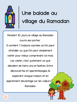 Il contient 7 maisons sacrĂ©es oĂč l'on peut s'installer ou que lâon peut simplement visiter pour mieux comprendre ce mois. Les visiter, c'est justement ce que dĂ©cident de faire Lina et Nathan. Entre dĂ©couvertes et apprentissages, ils explorent chaque maison et en apprennent davantage sur les valeurs du Ramadan.