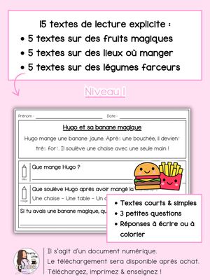 15 textes de lecture sur des fruits magiques, des lieux oĂč manger et des lĂ©gumes farceurs.