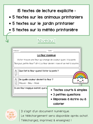 đ Je vous ai prĂ©paré 15 comprĂ©hension Ă la lecture sur le printemps de niveau 1 qui vous attendent pour entrainer vos loulous aux questions - rĂ©ponses.