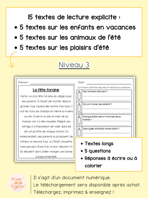 ☀️ Je vous ai préparé 15 compréhension à la lecture sur l'été de niveau 3 qui vous attendent pour entrainer vos loulous aux questions - réponses.