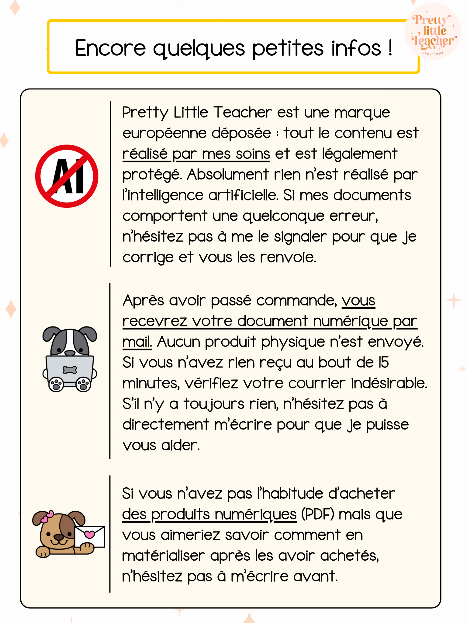 Il s'agit d'un produit numérique (PDF non modifiable). Une fois le paiement effectué, vous recevrez un mail confirmant votre commande 1 minute plus tard, suivi d'un second mail 1 minute plus tard avec le lien de téléchargement. S'il s'agit de votre première commande, n'hésitez pas à vérifier votre courrier indésirable.