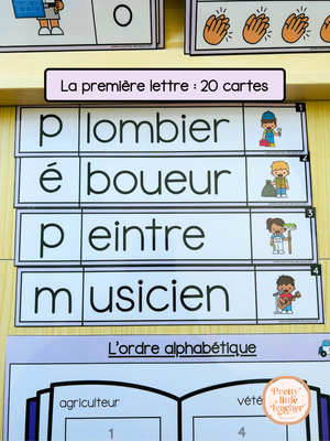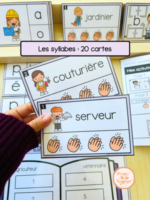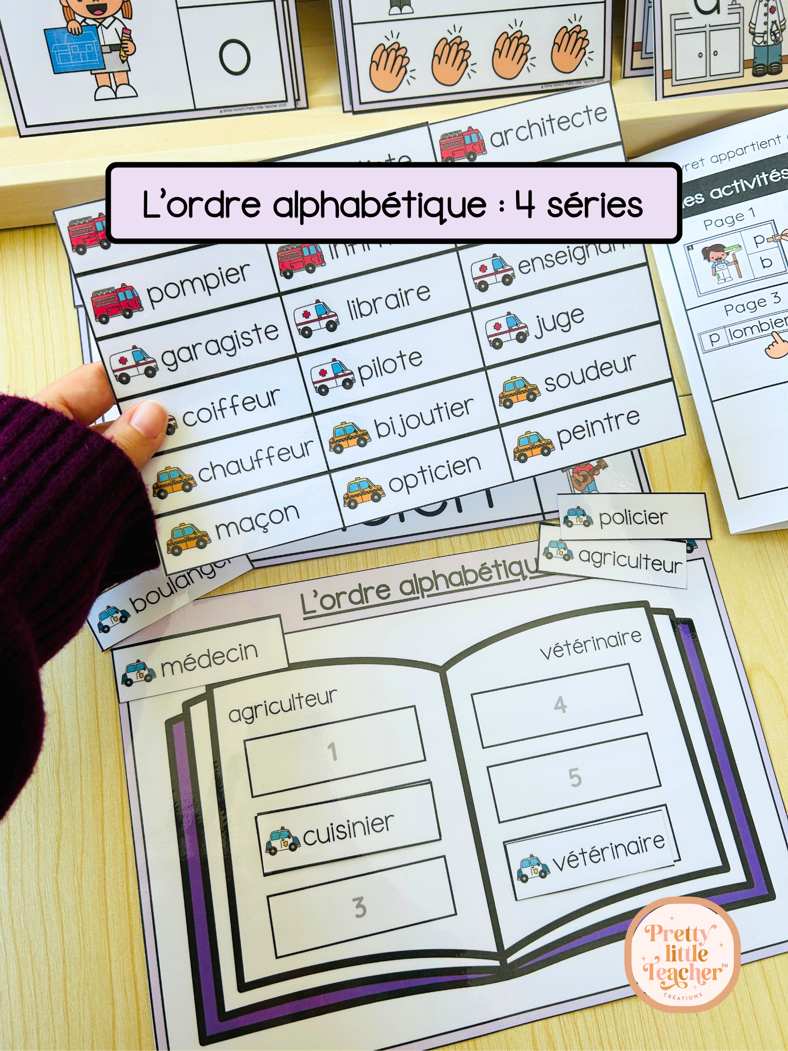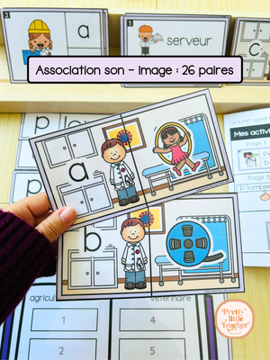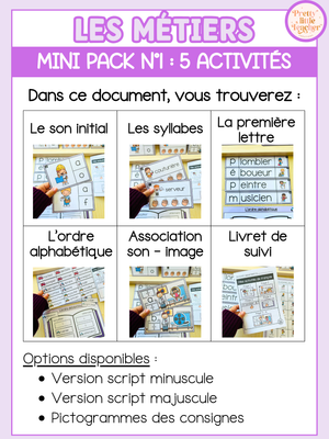 👩🏻🏫 Je vous ai préparé 5 ateliers de jeu sur le thème des métiers pour aller à la rencontre de ses premiers mots de vocabulaires thématiques. Ce document vous propose une version en écriture script minuscule et en majuscule. 🎁