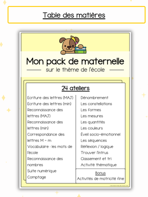 ✏️ Voici les matières abordées dans ce Pack Maternelle sur le thème de l'école :