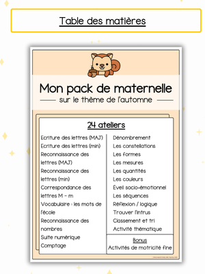 đ Voici les matiĂšres abordĂ©es dans ce Pack Maternelle sur le thĂšme de l'automne :Â